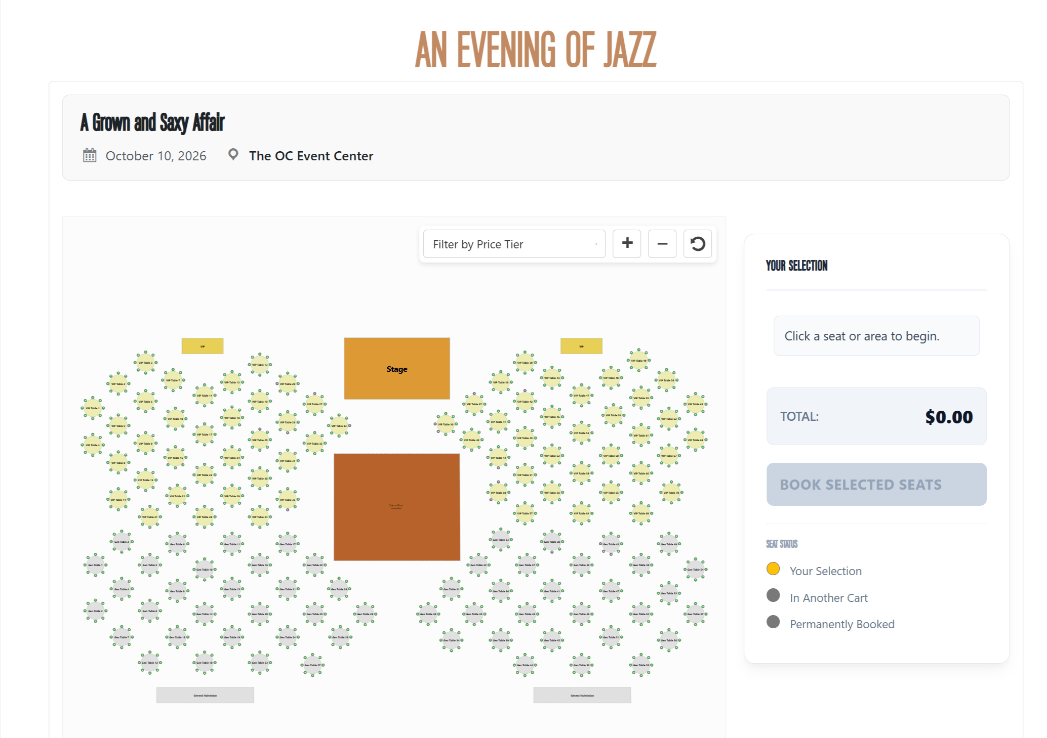 Real-Time Seat Holding: The split-second a customer adds a seat or VIP table to their cart, it is instantly locked and shows as “Unavailable” to everyone else viewing your seating chart.